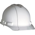 Lightweight, durable, high density polyethylene hard hat has 4 point nylon Quick-snap™ suspension with ratchet adjustment.