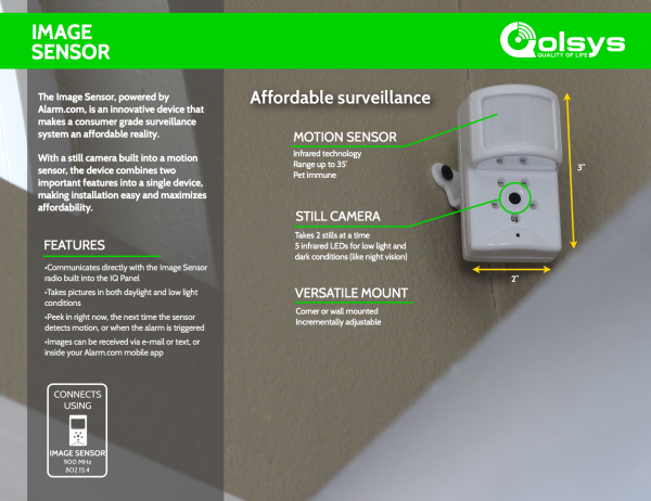 The Image Sensor is a motion sensor with a built in still camera. The motion sensor has a range up to 40′. Like the motion sensor, it can be installed for pet sensitivity, reducing the risk of a false alarm in homes with pets, but it also has the unique ability to take still photographs.