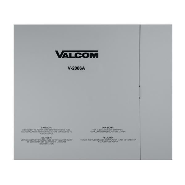Valcom’s V-2006A, 6 Zone, One-way Page Control European Version that allows the user to page six individual zones of one-way paging and all call. The built-in tone generator enables you to notify with individuals through a variety of tones indicating various events such as break time. The V-2006A also has an emergency page override for priority messages so you can alert individuals of emergency or priority notifications.